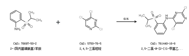 1.通过2-(异丙基磺酰基)苯胺和2,4,5-三氯嘧啶合成2,5-二氯-N-[2-[(1-甲基乙基)磺酰]苯基],收率约61%;