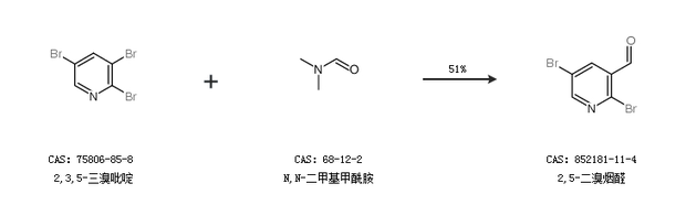 1.通过2,3,5-三溴吡啶和N,N-二甲基甲酰胺合成2,5-二溴烟醛,收率约51%;