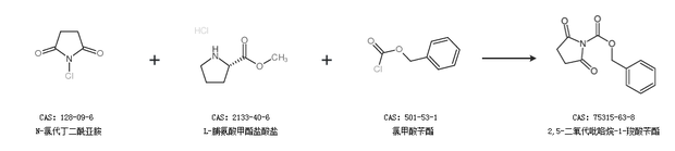 1.通过N-氯代丁二酰亚胺、L-脯氨酸甲酯盐酸盐和氯甲酸苄酯合成2,5-二氧代吡咯烷-1-羧酸苄酯