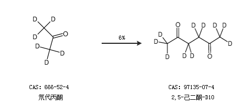 1.通过氘代丙酮合成2,5-己二酮-D10,收率约6%;