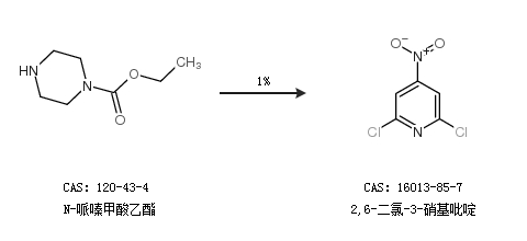 2.通过N-哌嗪甲酸乙酯合成2,6-二氯-3-硝基吡啶,收率约1%;