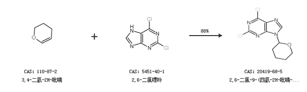 1.通过3,4-二氢-2H-吡喃和2,6-二氯嘌呤合成2,6-二氯-9-(四氢-2H-吡喃-2-基)-9h-嘌呤,收率约88%;