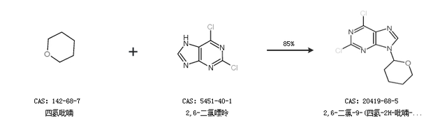 2.通过四氢吡喃和2,6-二氯嘌呤合成2,6-二氯-9-(四氢-2H-吡喃-2-基)-9h-嘌呤,收率约85%;