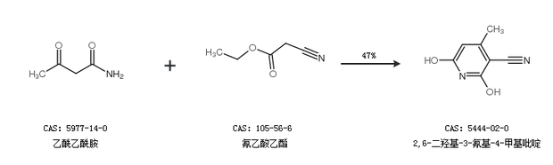 1.通过乙酰乙酰胺和氰乙酸乙酯合成2,6-二羟基-3-氰基-4-甲基吡啶,收率约47%;