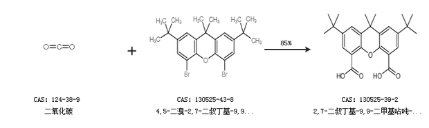1.通过二氧化碳和4,5-二溴-2,7-二叔丁基-9,9-二甲基呫吨合成2,7-二叔丁基-9,9-二甲基呫吨-4,5-二羧酸,收率约85%;