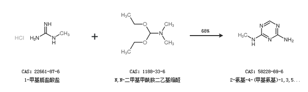 1.通过1-甲基胍盐酸盐和N,N-二甲基甲酰胺二乙基缩醛合成2-氨基-4-(甲基氨基)-1,3,5-三嗪,收率约68%;