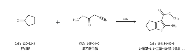 2.通过甲醇、氰乙酸和环戊酮合成2-氨基-5,6-二氢-4H-环戊烯并噻吩-3-甲酸甲酯,收率约90%;
