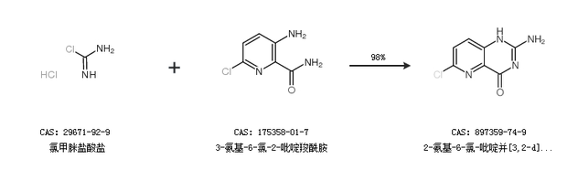 1.通过氯甲脒盐酸盐和3-氨基-6-氯-2-吡啶羧酰胺合成2-氨基-6-氯-吡啶并[3,2-d]嘧啶-4(1h)-酮,收率约98%;