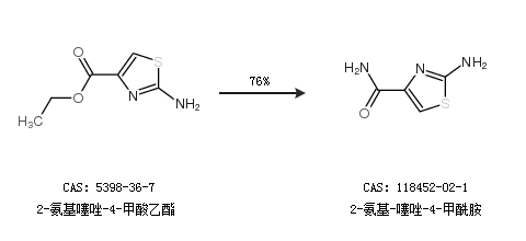 1.通过2-氨基噻唑-4-甲酸乙酯合成2-氨基-噻唑-4-甲酰胺,收率约76%;
