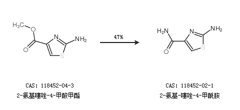2.通过2-氨基噻唑-4-甲酸甲酯合成2-氨基-噻唑-4-甲酰胺,收率约47%;