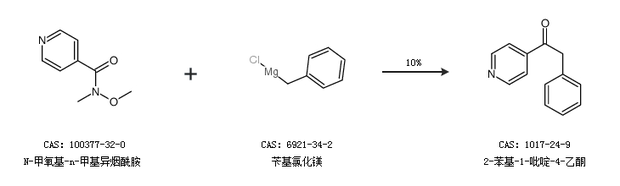1.通过N-甲氧基-n-甲基异烟酰胺和苄基氯化镁合成2-苯基-1-吡啶-4-乙酮,收率约10%;