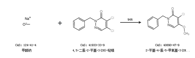 1.通过甲醇钠和4,5-二氯-2-苄基-3(2H)-哒嗪合成2-苄基-4-氯-5-甲氧基-3(2H-)-吡嗪酮,收率约94%;