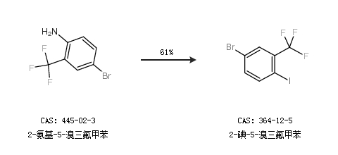 2.通过2-氨基-5-溴三氟甲苯合成2-碘-5-溴三氟甲苯,收率约61%;