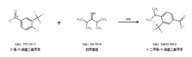 2.通过2-氯-5-硝基三氟甲苯和四甲基胍合成2-二甲氨-5-硝基三氟甲苯,收率约18%;