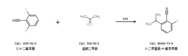 1.通过2,6-二氟苯腈和盐酸二甲胺合成2-二甲基氨-6-氟苯甲腈,收率约63%;