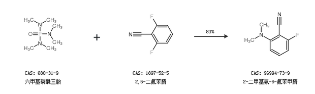 2.通过六甲基磷酰三胺和2,6-二氟苯腈合成2-二甲基氨-6-氟苯甲腈,收率约83%;