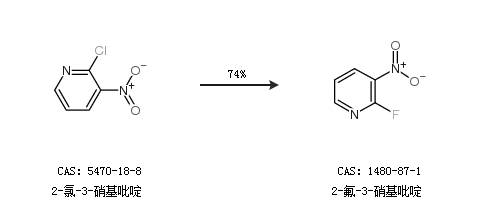 1.通过2-氯-3-硝基吡啶合成2-氟-3-硝基吡啶,收率约74%;