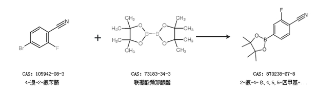 2.通过4-氰基-3-氟苯硼酸和频哪醇合成2-氟-4-(4,4,5,5-四甲基-1,3,2-二噁硼烷-2-基)苯甲腈,收率约87%;