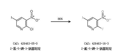 1.通过2-氯-5-碘-3-硝基吡啶合成2-氟-5-碘-3-硝基吡啶,收率约86%;