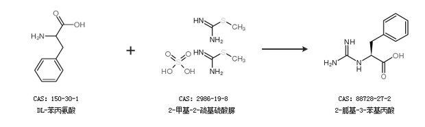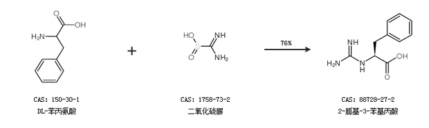 1.通过DL-苯丙氨酸和二氧化硫脲合成2-胍基-3-苯基丙酸,收率约76%;