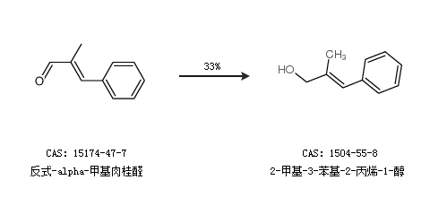 1.通过反式-alpha-甲基肉桂醛合成2-甲基-3-苯基-2-丙烯-1-醇,收率约10%;