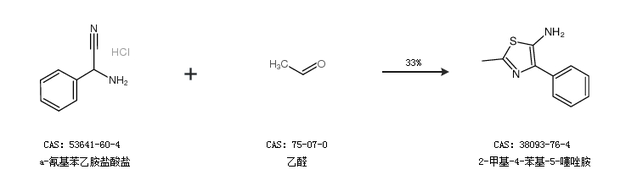 1.通过a-氰基苯乙胺盐酸盐和乙醛合成2-甲基-4-苯基-5-噻唑胺,收率约33%;