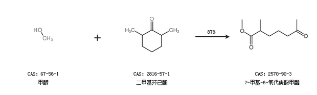 2.通过甲醇和二甲基环已酮合成2-甲基-6-氧代庚酸甲酯,收率约87%;