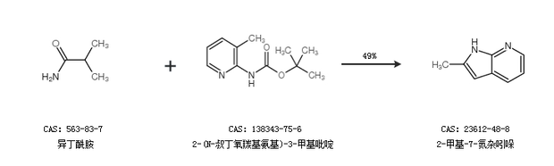 2.通过异丁酰胺和2-(N-叔丁氧羰基氨基)-3-甲基吡啶合成2-甲基-7-氮杂吲哚,收率约49%;