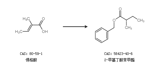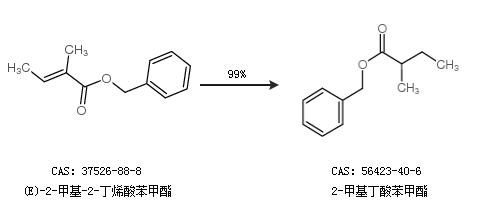 1.通过(E)-2-甲基-2-丁烯酸苯甲酯合成2-甲基丁酸苯甲酯,收率约99%;