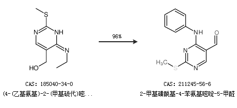1.通过(4-(乙基氨基)-2-(甲基硫代)嘧啶-5-基)甲醇合成2-甲基磺酰基-4-苯氨基嘧啶-5-甲醛,收率约96%;
