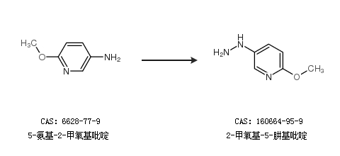 1.通过5-氨基-2-甲氧基吡啶合成2-甲氧基-5-肼基吡啶,收率约93%;