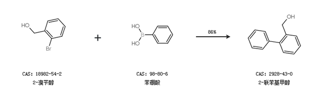 1.通过2-溴苄醇和苯硼酸合成2-联苯基甲醇,收率约86%;
