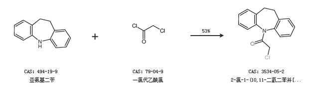 英文别名 5-chloroacetyl-10,11-dihydro-5H-dibenz[b,f]azepine;1-(10H,11H-dibenzo[b,f]azepin-5-yl)-2-chloroethan-1-one;5-Chloracetyliminobibenzyl;2-Chloro-1-(10,11-dihydro-dibenzo[b,f]azepin-5-yl)-ethanone;5-chloroacetyl-10,11-dihydro-5H-dibenzo[b,f]azepine;10,11-Dihydro-5-(chloracetyl)-5H-dibenz <b,f> azepin;5-Chloracetyl-10,11-dihydro-5H-dibenz[b,f]azepin;5-Chloracetyl-iminodibenzyl;