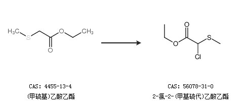 1.通过(甲硫基)乙酸乙酯合成2-氯-2-(甲基硫代)乙酸乙酯
