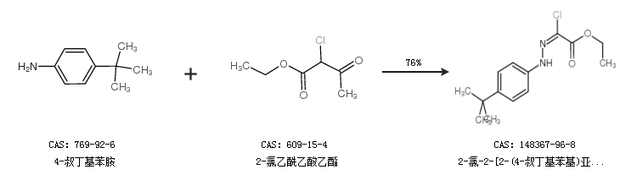 1.通过4-叔丁基苯胺和2-氯乙酰乙酸乙酯合成2-氯-2-[2-(4-叔丁基苯基)亚肼基]乙酸乙酯,收率约76%;