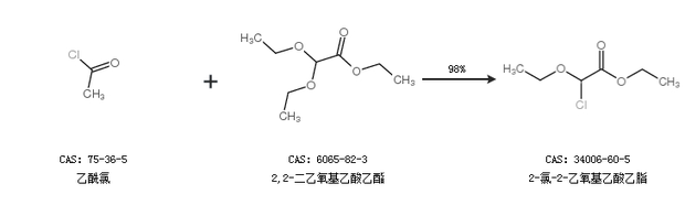 2.通过乙酰氯和2,2-二乙氧基乙酸乙酯合成2-氯-2-乙氧基乙酸乙脂,收率约98%;