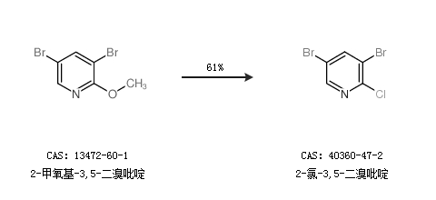 1.通过2-甲氧基-3,5-二溴吡啶合成2-氯-3,5-二溴吡啶,收率约61%;