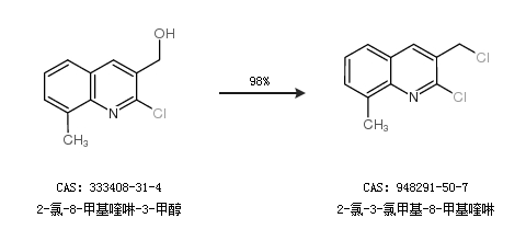 1.通过2-氯-8-甲基喹啉-3-甲醇合成2-氯-3-氯甲基-8-甲基喹啉,收率约98%;