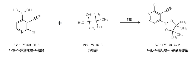 1.通过2-氯-3-氰基吡啶-4-硼酸和频哪醇合成2-氯-3-氰吡啶-4-硼酸频哪酯,收率约77%;