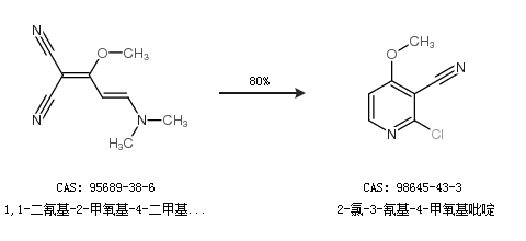 2.通过1,1-二氰基-2-甲氧基-4-二甲基氨基-1,3-丁二烯合成2-氯-3-氰基-4-甲氧基吡啶,收率约80%;