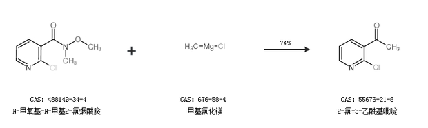 2.通过N-甲氧基-N-甲基2-氯烟酰胺和甲基氯化镁合成2-氯-3-乙酰基吡啶,收率约74%;