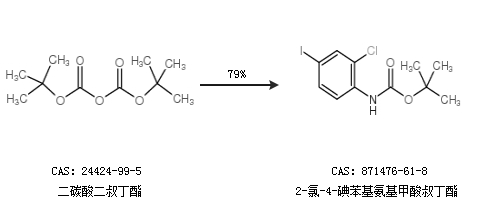 2.通过二碳酸二叔丁酯合成2-氯-4-碘苯基氨基甲酸叔丁酯,收率约79%;