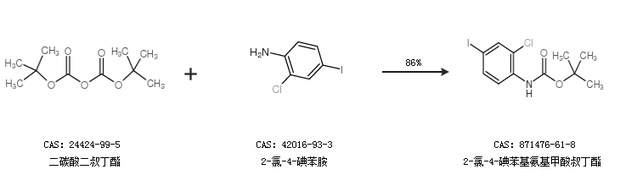 1.通过二碳酸二叔丁酯和2-氯-4-碘苯胺合成2-氯-4-碘苯基氨基甲酸叔丁酯,收率约86%;