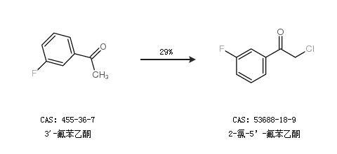 1.通过3''-氟苯乙酮合成2-氯-5’-氟苯乙酮,收率约29%;