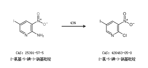 2.通过2-氨基-5-碘-3-硝基吡啶合成2-氯-5-碘-3-硝基吡啶,收率约43%;