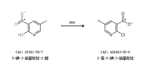 1.通过5-碘-3-硝基吡啶-2-醇合成2-氯-5-碘-3-硝基吡啶,收率约85%;