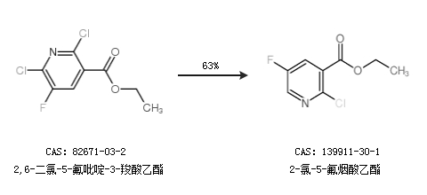 2.通过2,6-二氯-5-氟吡啶-3-羧酸乙酯合成2-氯-5-氟烟酸乙酯,收率约63%;