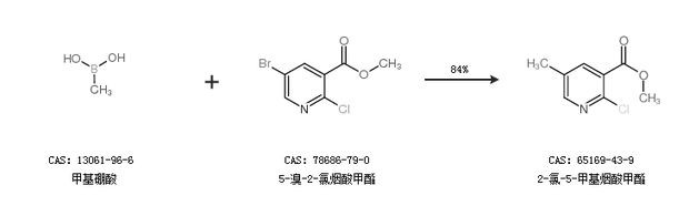 1.通过甲基硼酸和5-溴-2-氯烟酸甲酯合成2-氯-5-甲基烟酸甲酯,收率约84%;