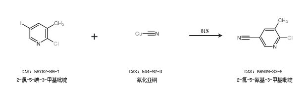 1.通过2-氯-5-碘-3-甲基吡啶和氰化亚铜合成2-氯-5-氰基-3-甲基吡啶,收率约81%;
