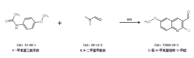 1.通过4''-甲氧基乙酰苯胺和N,N-二甲基甲酰胺合成2-氯-6-甲氧基喹啉-3-甲醛,收率约88%;